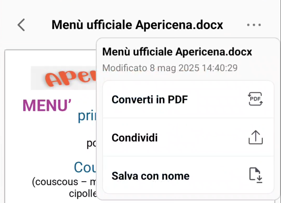 Vediamo come convertire un file .docx , cliccandolo da WhatsApp: si presenta il classico menu “Apri con”: