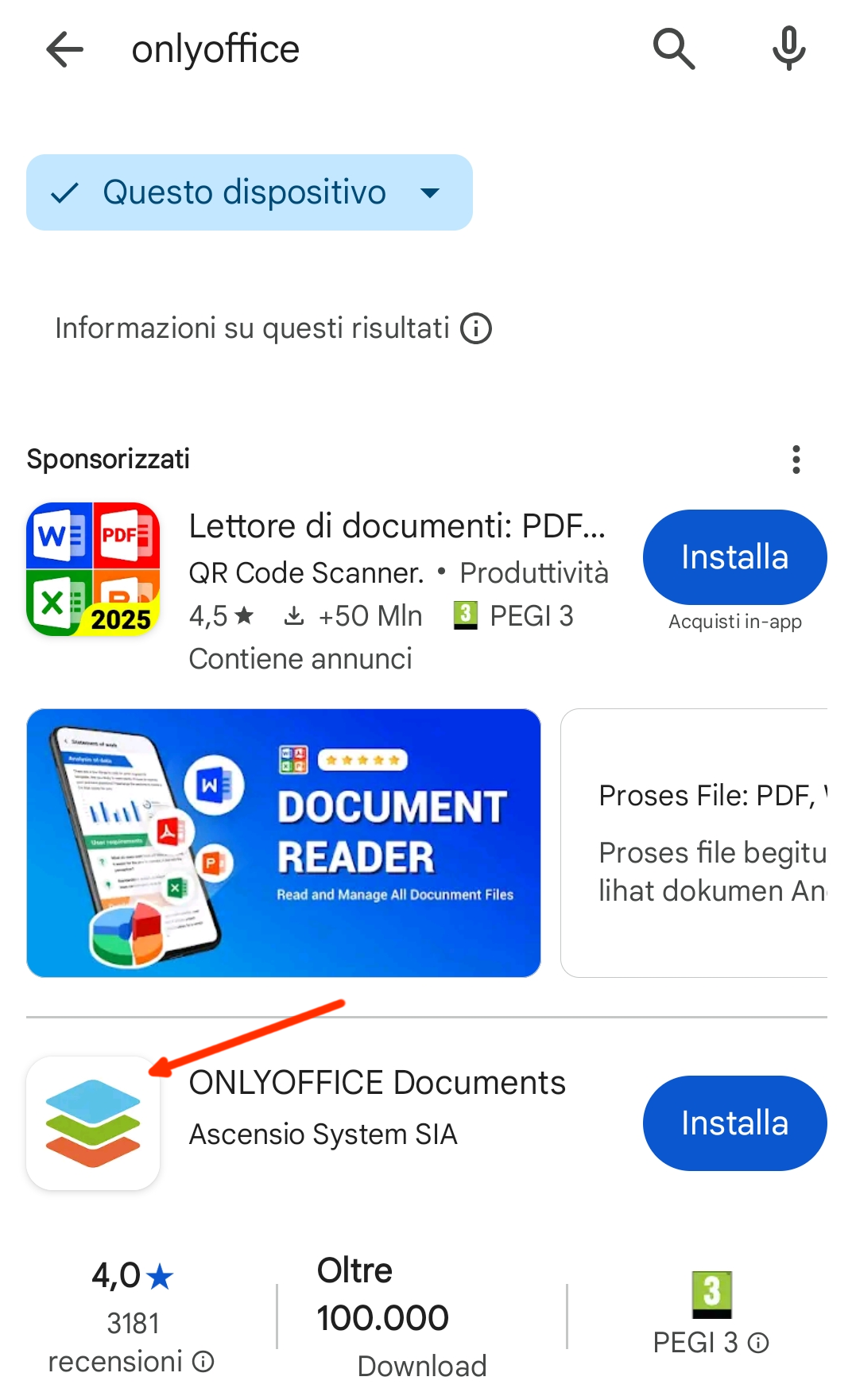 La trovate aprendo Google Play Store e cercando documenti (attenzione, non è detto che sia la prima nella lista, qui è la seconda):