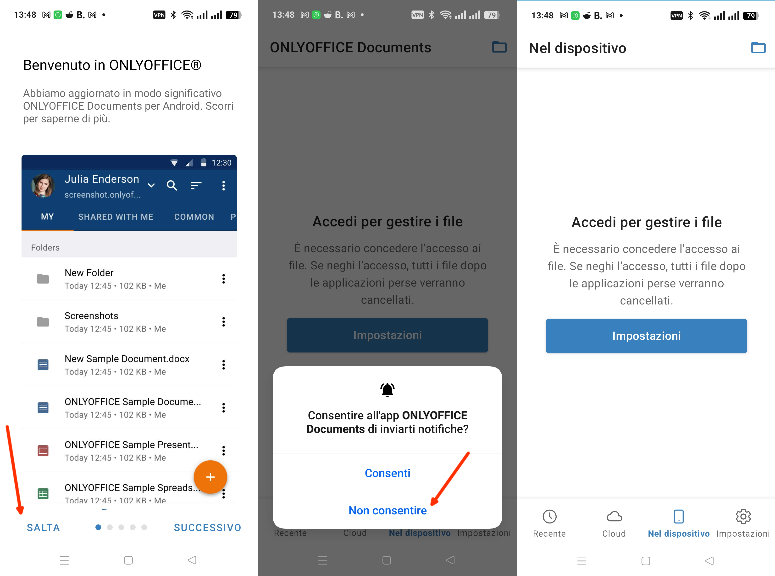 Dopo aver cliccato sul documento da aprire (in WhatsApp o su una pagina o una mail), scegliete OnlyOffice: e vedrete il documento desiderato.