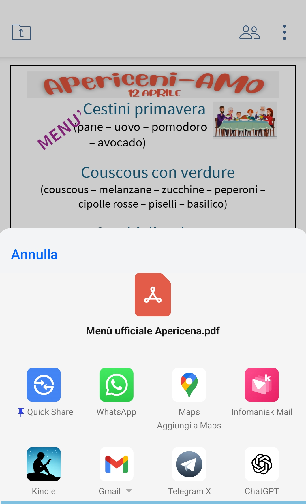 Adesso appare la finestrella di condivisione e basta scegliere WhatsApp, o la mail o quello che volete e il destinatario riceverà un pdf!