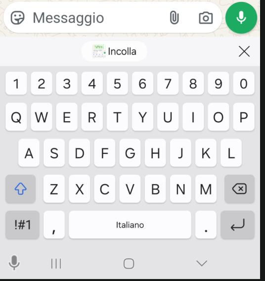 Ecco nella figura qui sotto la tastiera su WhatsApp. Su altri telefoni può apparire leggermente diversa. Il microfono verde c’è sempre (ed è quello che usate per i vocali).